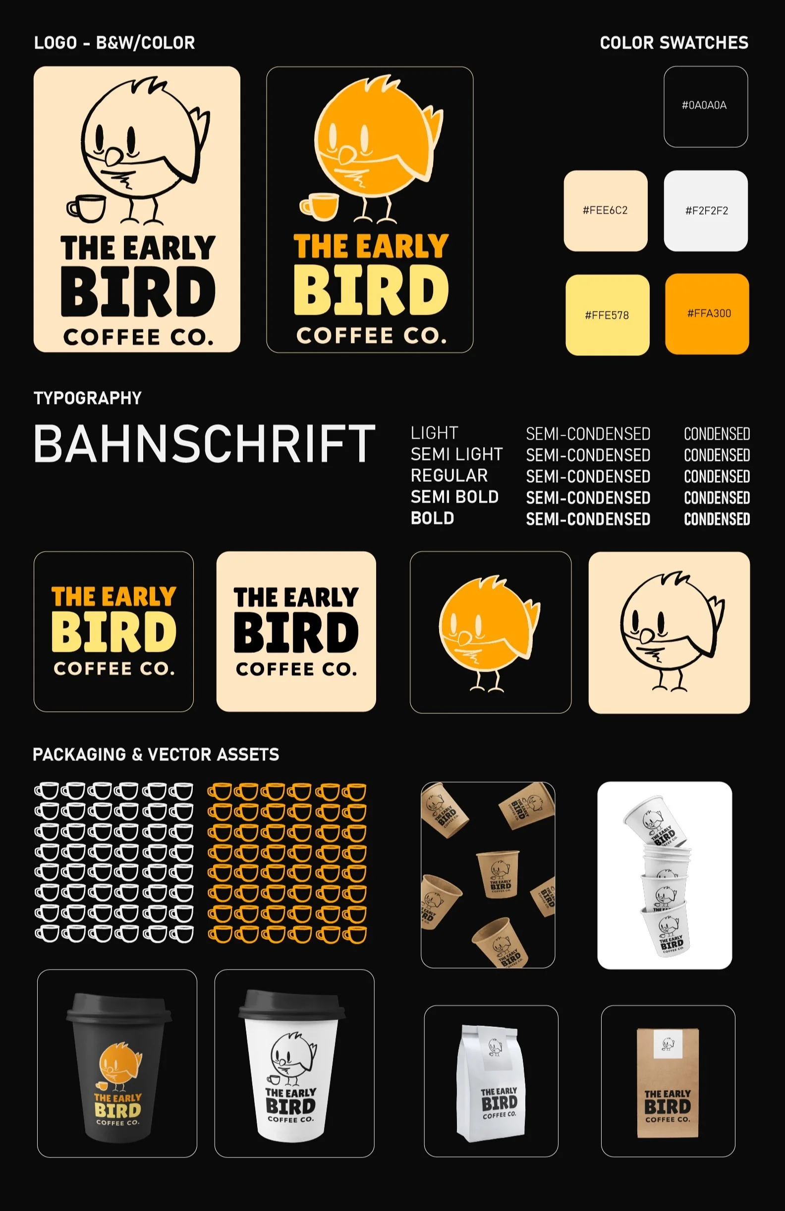 The Early Bird Coffee Co. project showcases branding and packaging design for a developing café shop. The design goals revolved around encompassing modern, simplistic elements with child like illustrations to push for a bold yet sleek identity. From the logo, color pallet and packaging variations, every detail reflects the buisness’s easy going yet bold nature.