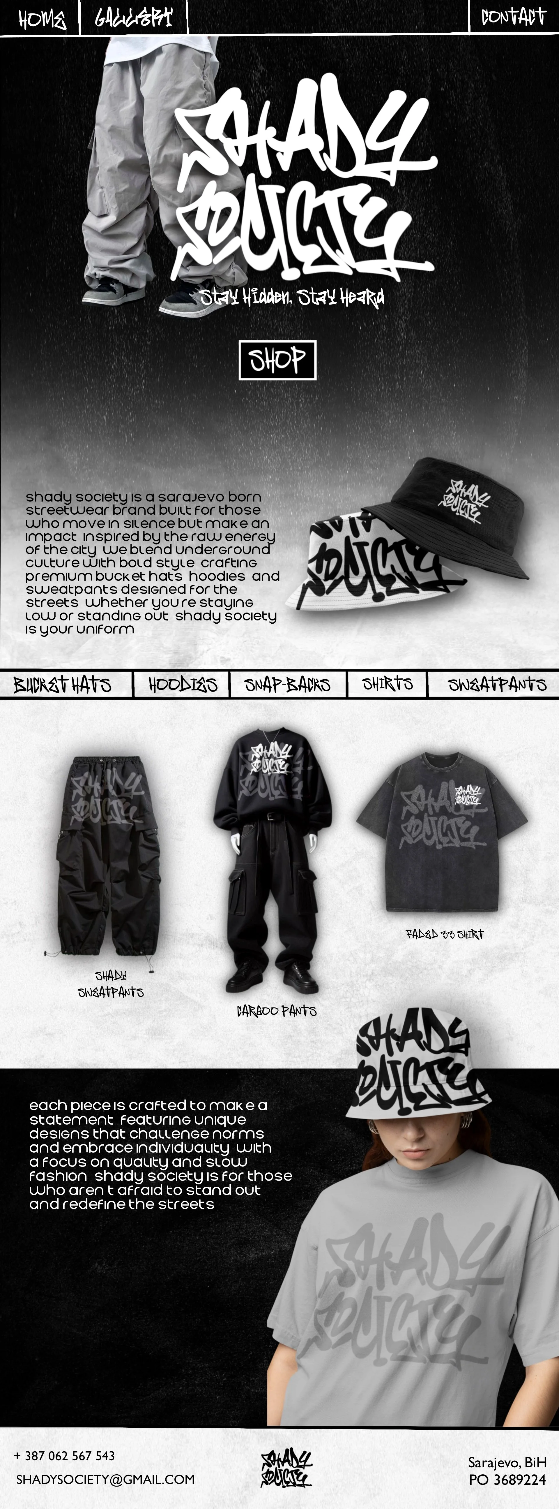 I designed the brand identity for Shady Society, capturing its bold, urban, and rebellious spirit through distinctive typography, modern colors, and edgy visuals. I also developed a sleek, user-friendly landing page that offers a seamless, engaging online experience. Additionally, I created custom apparel designs that reflect the brand's unique style, ensuring a cohesive merchandise collection. This project showcases my ability to craft a complete, impactful brand experience from identity to web design and product design.